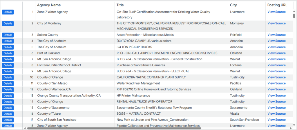 The Posting URL column provides a direct link to the official source of the opportunity posting.
